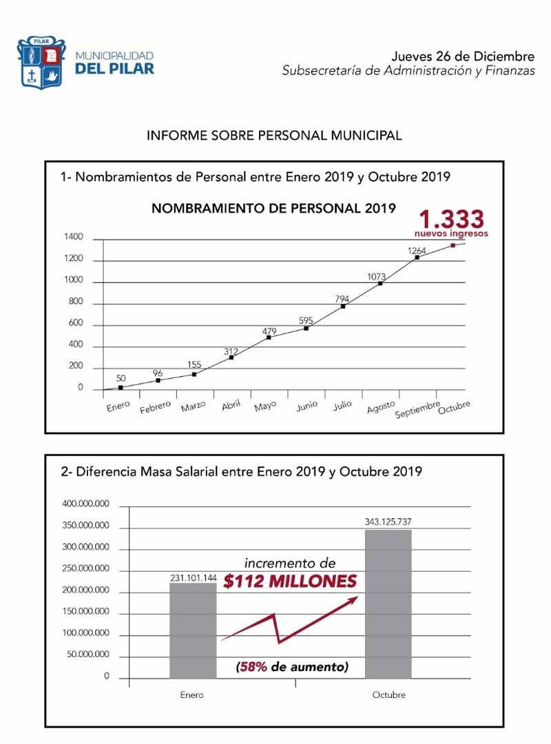 El informe de la subsecretaría de Administración y Finanzas, dejó en claro que la masa salarial total trepó en esos meses un 58%, al saltar de 231 millones de pesos en enero, a 343 millones en octubre, suba que se acomodó por más de 20 puntos por encima de la paritaria acordada en 2019.