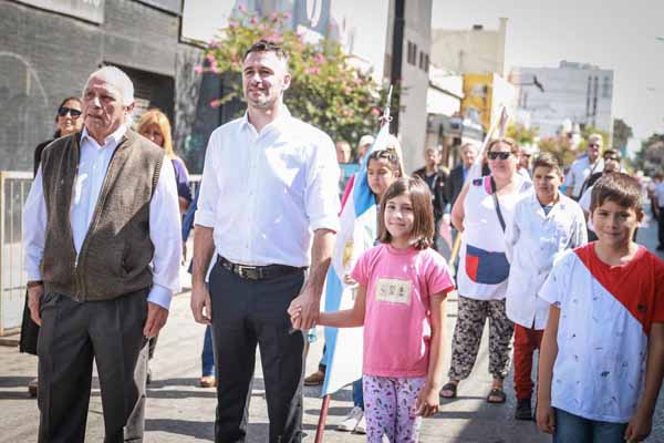 De la mano del ex alumno del Instituto Carlos Pellegrini, Juan Luis Bustos y de Valeria Maggio, alumna de 8 años de la Escuela N4 de Villa Verde; como símbolo de la historia, el presente y el futuro, el Jefe Comunal acompañó al pueblo pilarense en las primeras cuadras del desfile sobre la calle Rivadavia.