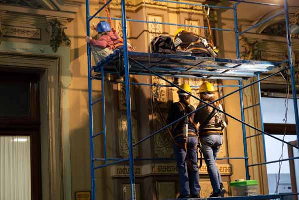 Un equipo de restauradores de la Universidad Nacional de San Martín comenzó con las tareas de restauración de restauración de las pinturas decorativas del hall principal y del Salón Dorado de la Casa de Gobierno bonaerense en el marco de los trabajos de puesta en valor de distintos edificios públicos.