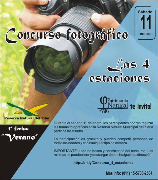 La Asociación Civil Patrimonio Natural del Partido de Pilar, invita a los ciudadanos a participar del Concurso Fotográfico “Las 4 estaciones” que desarrollará a lo largo del año 2020. La primera fecha, “Verano”, comenzará el día sábado 11 de enero a partir de las 9 horas. A lo largo de la jornada, los participantes podrán realizar tomas fotográficas en la Reserva Natural Municipal de Pilar que luego serán entregas para su posterior evaluación.