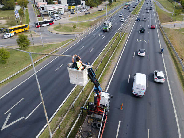 De hecho, el posicionamiento de las grúas de acceso a lo alto de las columnas y los vehículos de seguridad vial que señalizan los sectores de trabajo ocupan sólo un carril, lo que permite realizar el recambio de los artefactos de iluminación de los dos sentidos. Además, para minimizar las molestias a los conductores, las intervenciones se ejecutan del lado de la autopista y en el horario de menor intensidad de tránsito.