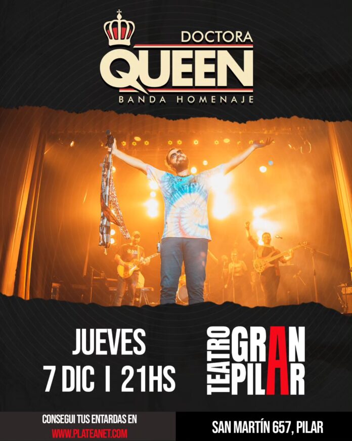 Doctora Queen, la banda homenaje a la legendaria agrupación Queen, oriunda de Luján se presentará el día jueves 7 de Diciembre a las 21:00 hs en el Teatro Gran Pilar, ubicado en San Martín 657. La banda que deslumbró al jurado de Got Talent Argentina ofrecerá un show con lo mejor del repertorio de la mítica agrupación liderada por Freddy Mercury pero añadiendo su propia impronta. El show, que llega de la mano de Pancho Laneri, tiene una duración aproximada de 120 minutos y las entradas pueden adquirirse en www.plateanet.com por un valor que varía entre 4.500 y 5.000 pesos argentinos o en la boleteria del teatro.