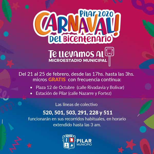 Por un lado, de 17 a 03 am, micros harán traslados gratuitos desde la Plaza 12 de Octubre (Rivadavia y Bolivar), y la Estación de Trenes de Pilar (Nazarre y Fortez).