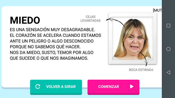 A través de diferentes pantallas, al elegir una emoción se podrá conocer su descripción, las principales manifestaciones físicas y las expresiones faciales que la caracterizan. También se podrá relacionar emociones con situaciones cotidianas que las producen. Al finalizar el trabajo con cada emoción hay sugerencias para compartir con otros ese estado de ánimo (alegría) y también posibles actividades para superar momentos de dificultad (enojo, tristeza, miedo).