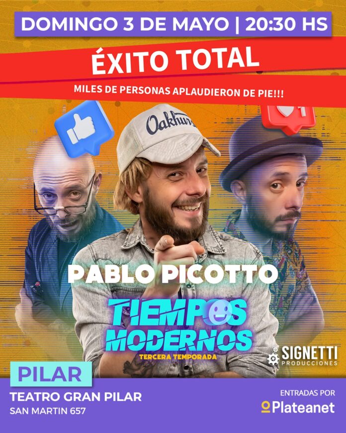 Este domingo 3 de mayo a las 20.30 hs llega al Teatro Gran Pilar (San Martín 657) el espectáculo de Pablo Picotto. Entradas y más info en https://www.plateanet.com/obra/28284?obra=PABLO-PICOTTO—TIEMPOS-MODERNOS__&paso=inicio Por consultas de boletería enviar WhatsApp al: 11 8059-2024